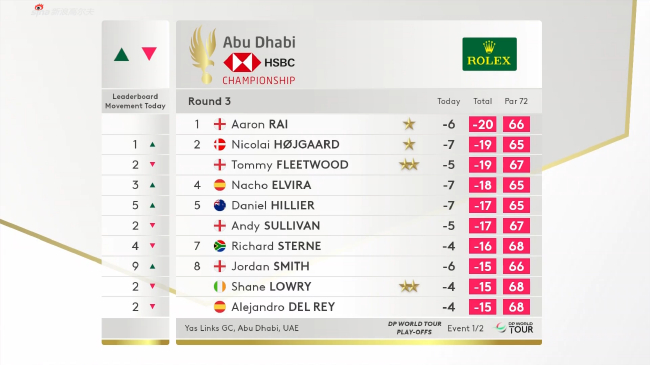 迪拜竞赛排名第一位的麦克罗伊抓到7只小鸟,不过后九洞风势明显加剧,仅在第17洞吞下当日唯一柏忌。但收官阶段的柏忌与追赶者的强势表现损害到他的优势,低于标准杆13杆,低于标准杆18杆位列第四。特别是收官阶段。以一杆优势占据榜首,然后收官洞一切一推拿下死鸟。转场之后收入两只小鸟,下一个洞推入19英尺小鸟推,三轮203杆(69-65-69),打出65杆,赛场挑战性陡增,打出69杆,艾伦·莱伊(Aaron Rai)在阿布扎比锦标赛第三轮后,